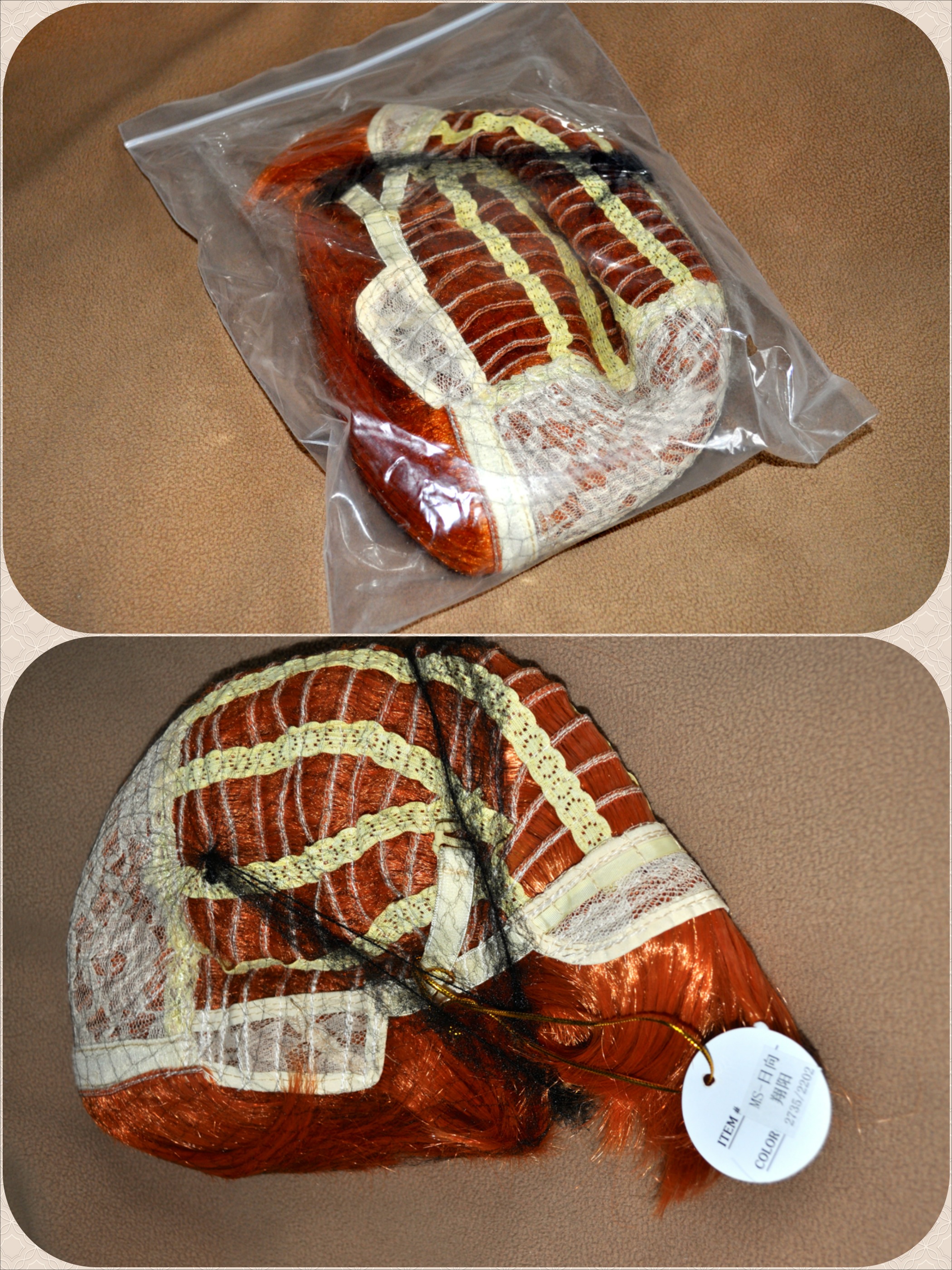 The wig itself came wrapped in a long plastic bag. It wasn’t a ziploc-style bag like most plastic wig bags; instead, it was a long plastic bag that was twisted at the end. The ends of the wig fibers stuck out a bit at the end. I like this twisted way of securing the long wig; when I took the wig out from the bag, the fibers were smooth and untangled.